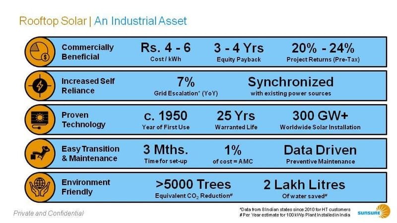 Rooftop Solar is an exciting prospect for Industries today. With tariffs up to 60% below existing Grid rates, great technology and easy transition, Industries stand to save big money on energy use, become more energy secure and create sizeable environmental gains. Sustainably!